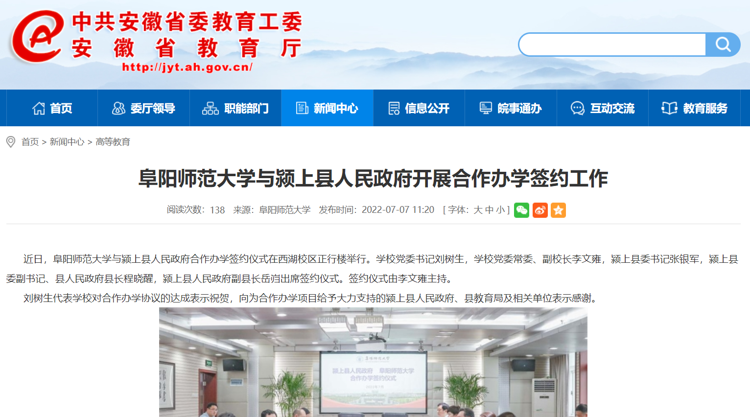7月7日,安徽教育网报道:阜阳师范大学与颍上县人民政府开展合作办学签约工作。文章地址:
