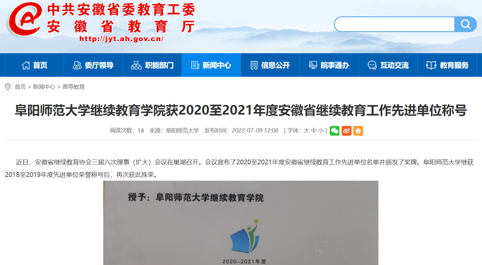 7月9日,安徽教育网报道:阜阳师范大学继续教育学院获2020至2021年度安徽省继续教育工作先进单位称号。文章地址:http://jyt.ah.gov.cn/xwzx/gdjy/40579385.html