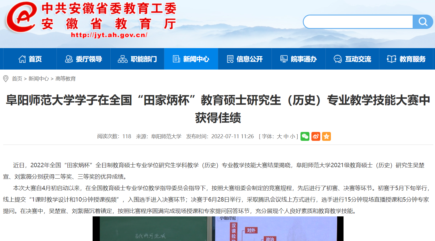 7月11日,安徽教育网报道:阜阳师范大学学子在全国“田家炳杯”教育硕士研究生(历史)专业教学技能大赛中获得佳绩。文章地址:http://jyt.ah.gov.cn/xwzx/gdjy/40579735.html