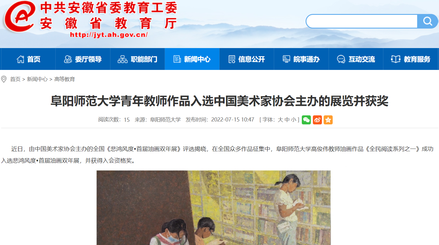 7月15日,安徽教育网报道:阜阳师范大学青年教师作品入选中国美术家协会主办的展览并获奖。文章地址: