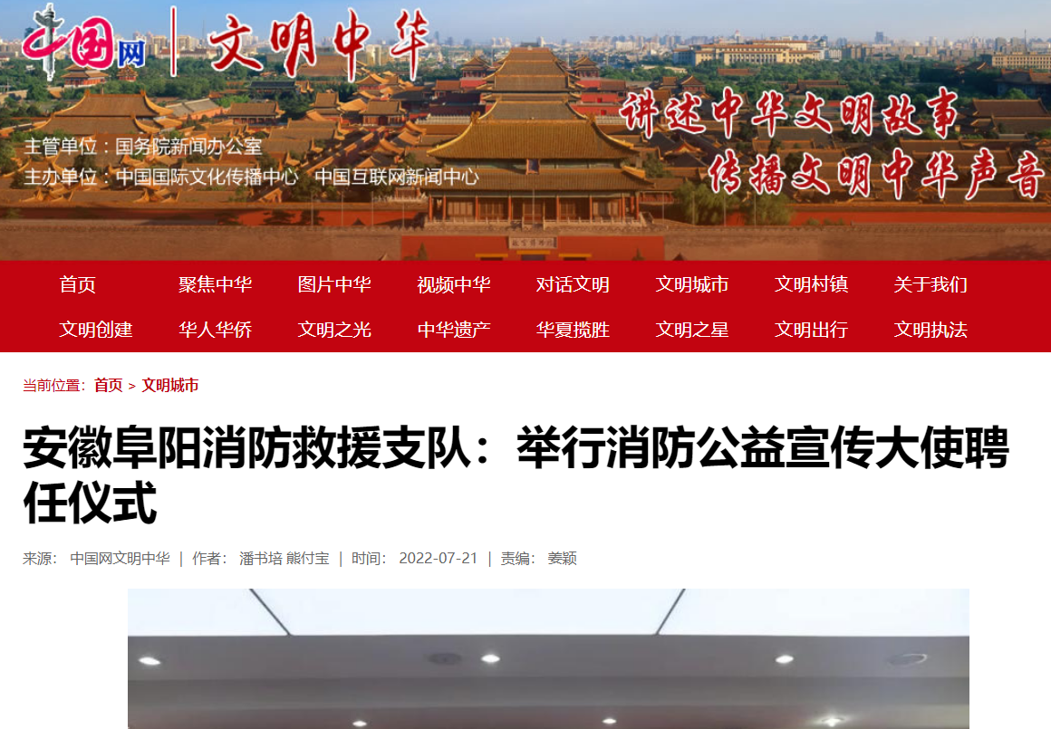 7月21日,中国网报道:安徽阜阳消防救援支队举行消防公益宣传大使聘任仪式。文章地址: