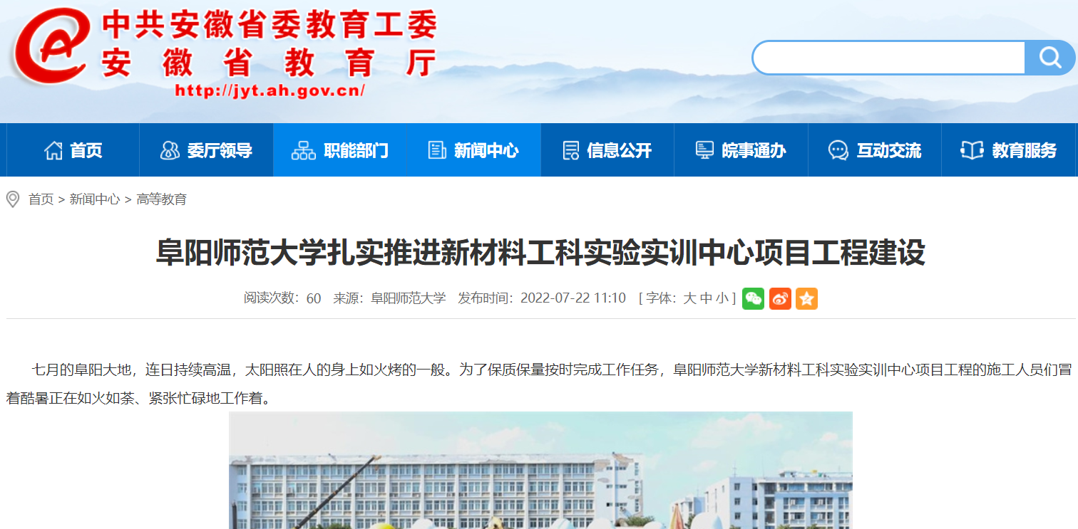 7月22日,安徽教育网报道:阜阳师范大学扎实推进新材料工科实验实训中心项目工程建设。文章地址: