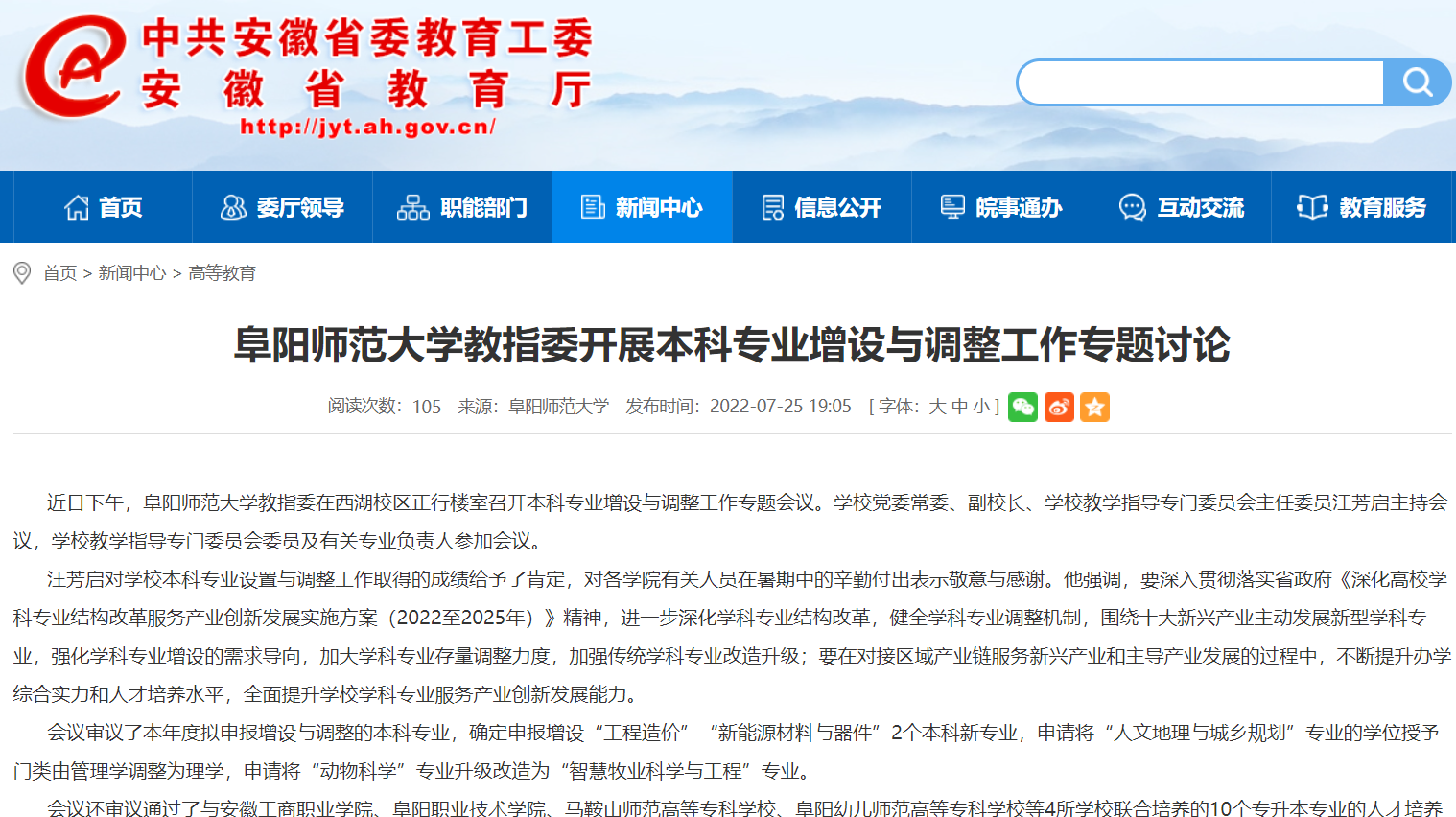 7月25日,安徽教育网报道:阜阳师范大学教指委开展本科专业增设与调整工作专题讨论。文章地址: