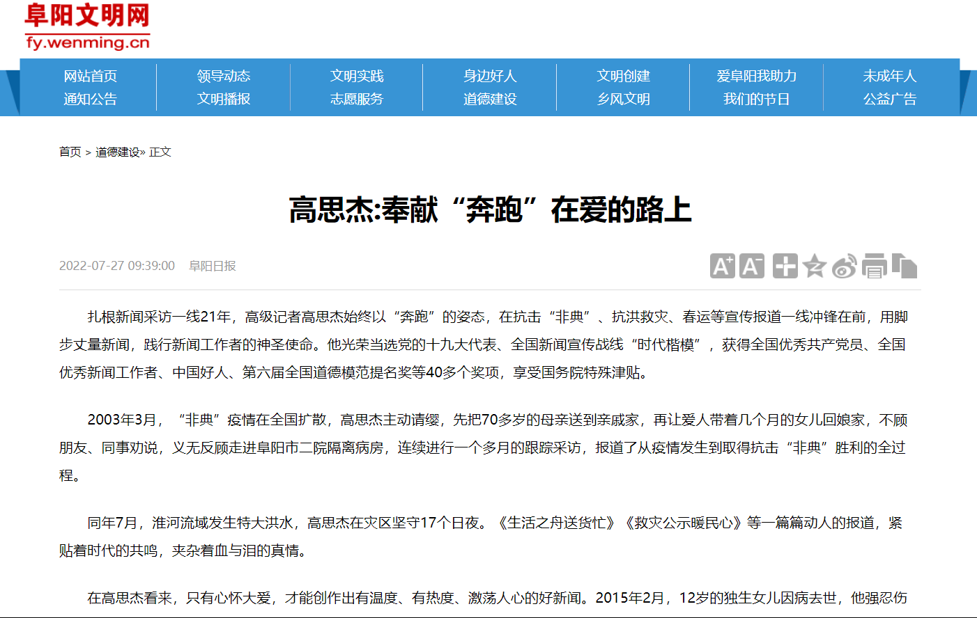 7月27日,阜阳文明网报道:高思杰 奉献“奔跑”在爱的路上。文章地址: