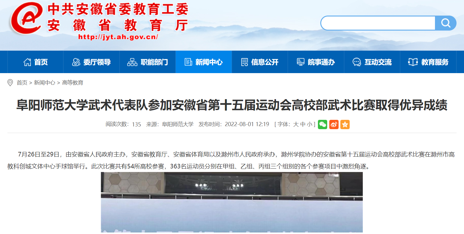 8月1日,安徽教育网报道:阜阳师范大学武术代表队参加安徽省第十五届运动会高校部武术比赛取得优异成绩。文章地址: