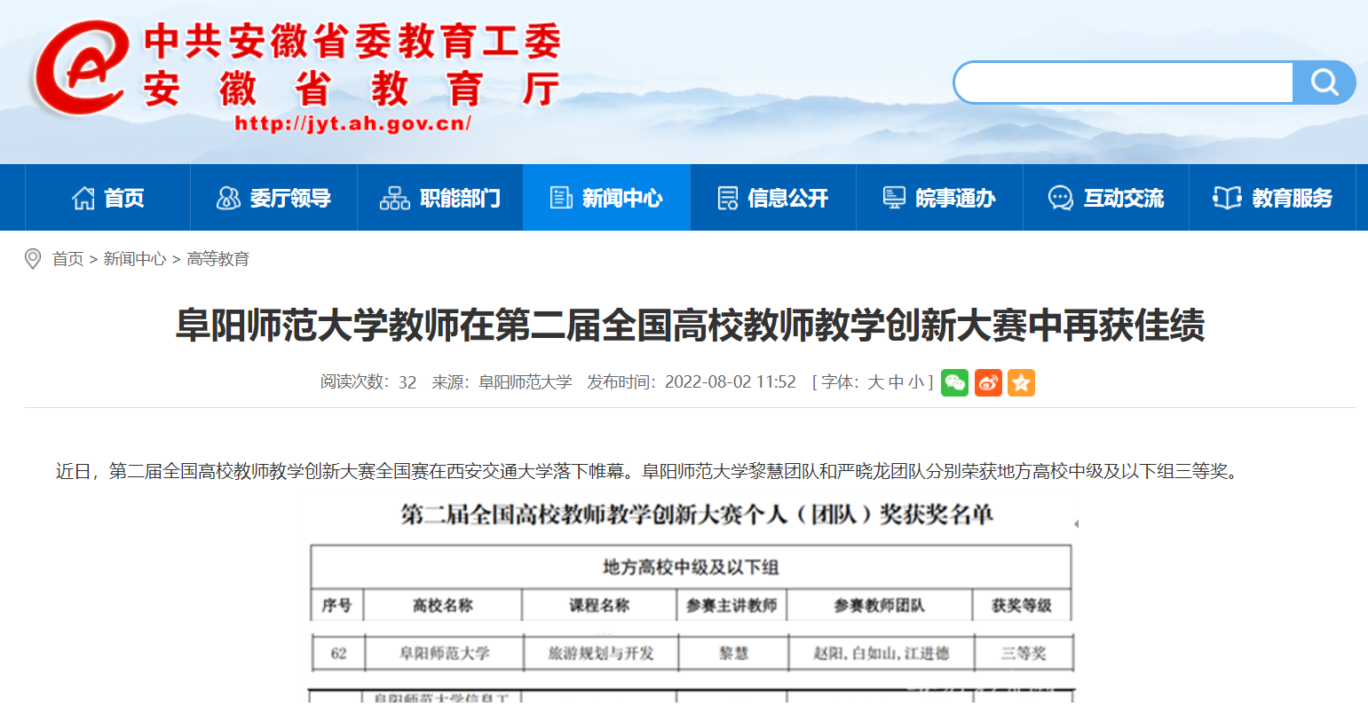 8月2日,安徽教育网报道:阜阳师范大学教师在第二届全国高校教师教学创新大赛中再获佳绩。文章地址: