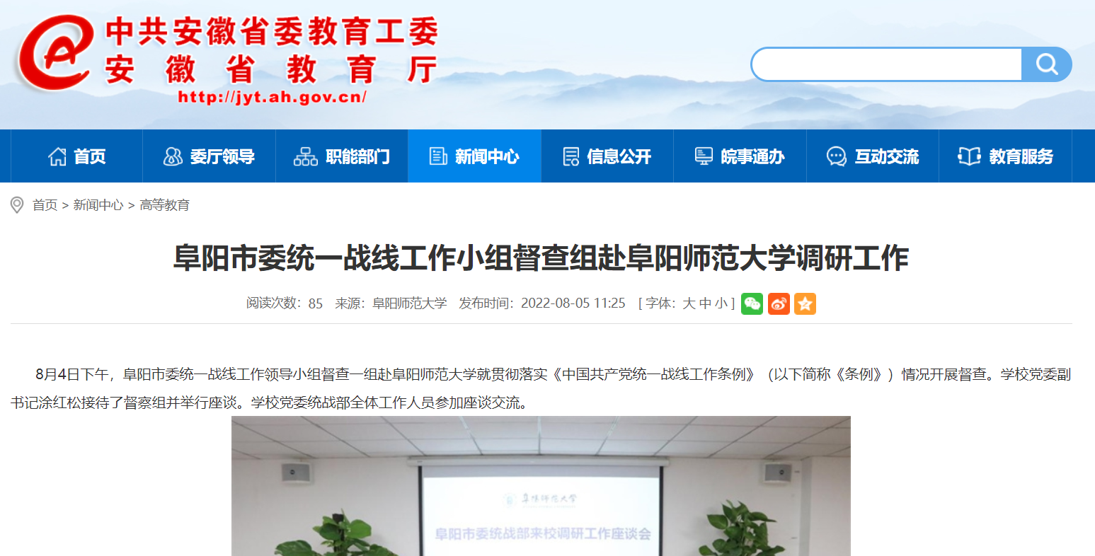 安徽教育网报道:阜阳市委统一战线工作小组督查组赴阜阳师范大学调研工作