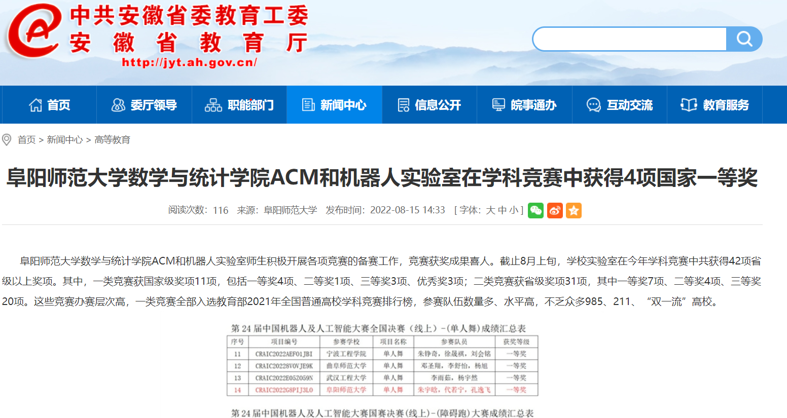 8月15日,安徽教育网报道:阜阳师范大学数学与统计学院ACM和机器人实验室在学科竞赛中获得4项国家一等奖。文章地址:http://jyt.ah.gov.cn/xwzx/gdjy/40589640.html