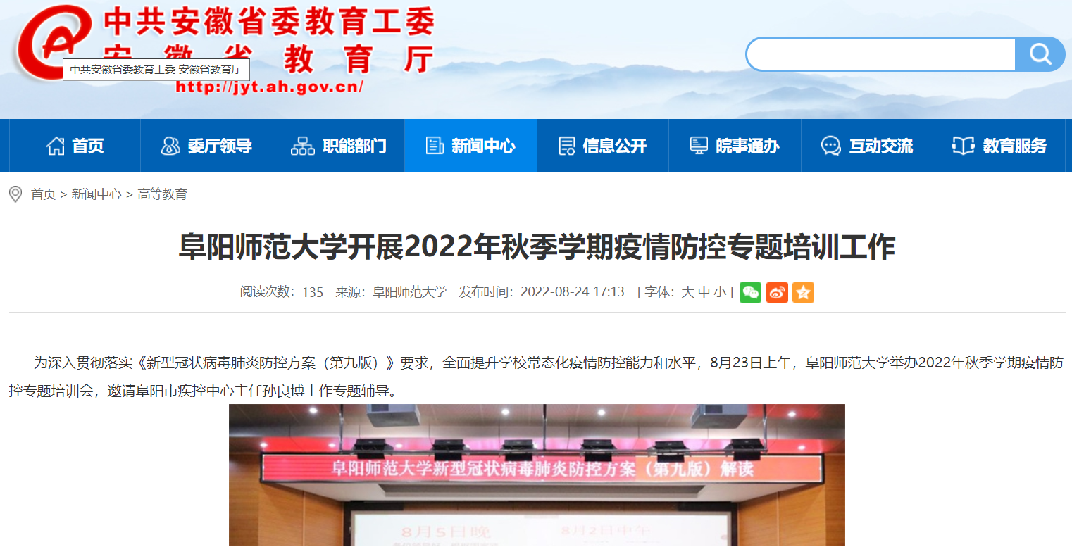 8月24日,安徽教育网报道:阜阳师范大学开展2022年秋季学期疫情防控专题培训工作。文章地址: