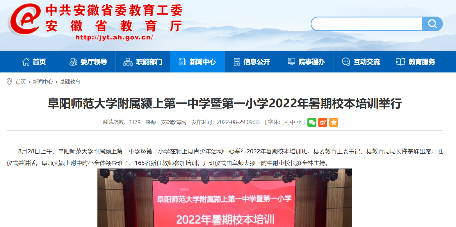 8月29日,安徽教育网报道:阜阳师范大学附属颍上第一中学暨第一小学2022年暑期校本培训举行。文章地址: