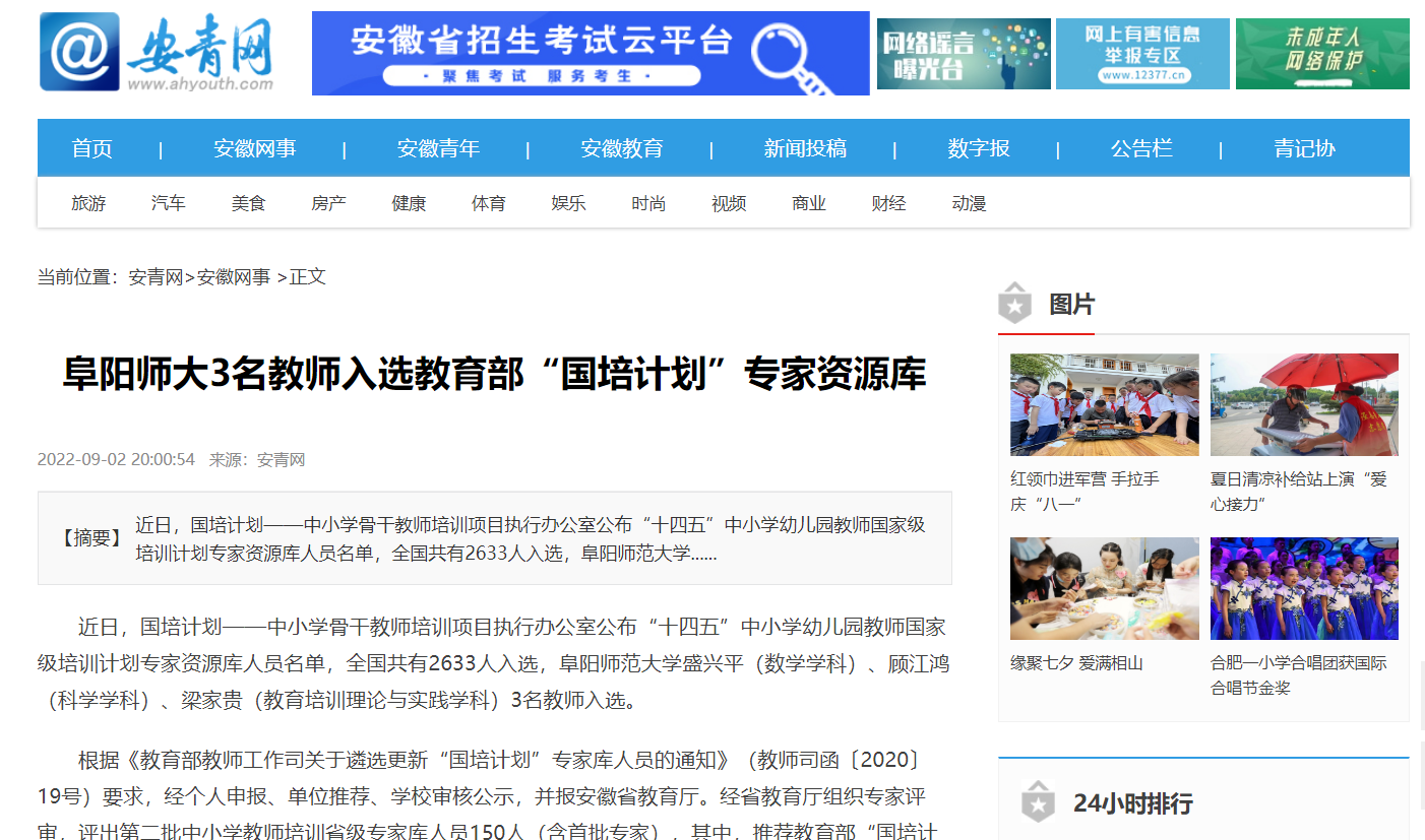 9月2日,安青网报道:阜阳师大3名教师入选教育部“国培计划”专家资源库。文章地址:
