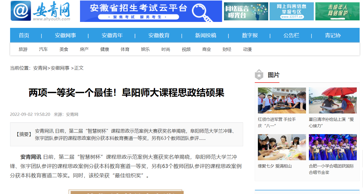 9月2日,安青网报道:两项一等奖一个最佳!阜阳师大课程思政结硕果。文章地址: