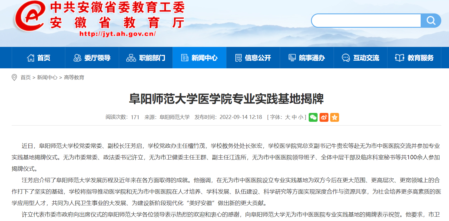 9月14日,安徽教育网报道:阜阳师范大学医学院专业实践基地揭牌。文章地址: