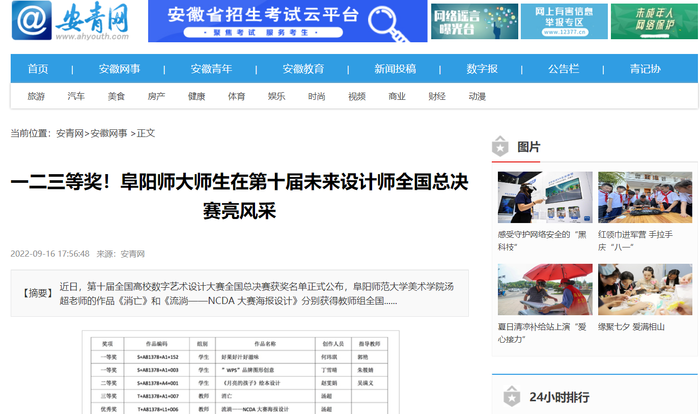 9月16日,安青网报道:一二三等奖!阜阳师大师生在第十届未来设计师全国总决赛亮风采。文章地址: