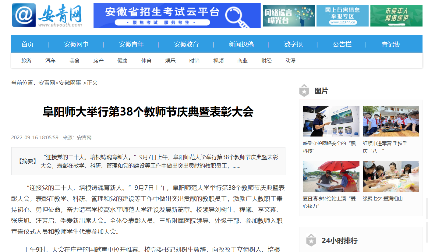 9月16日,安青网报道:阜阳师大举行第38个教师节庆典暨表彰大会。文章地址: