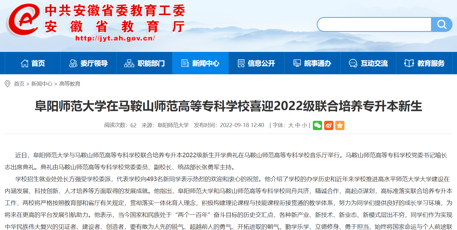 9月18日,安徽教育网报道:阜阳师范大学在马鞍山师范高等专科学校喜迎2022级联合培养专升本新生。文章地址: