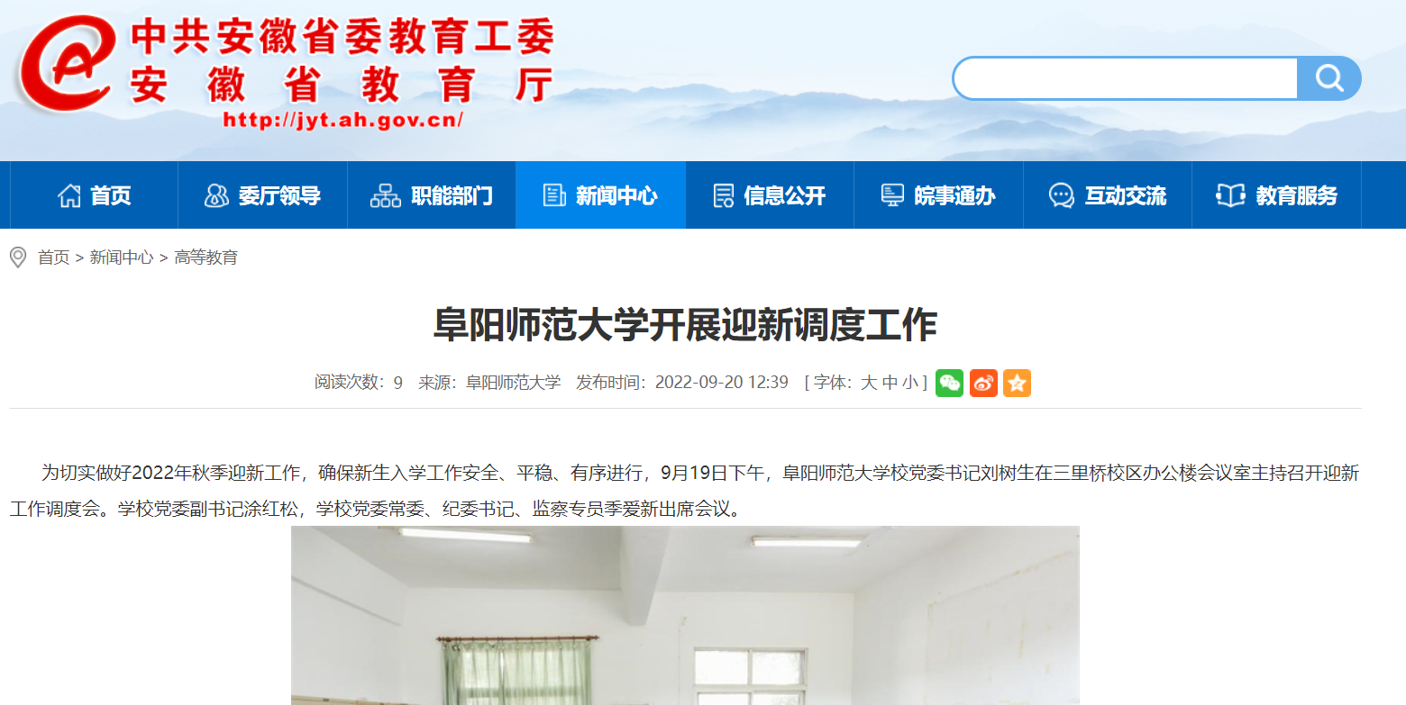 9月20日,安徽教育网报道:阜阳师范大学开展迎新调度工作。文章地址: