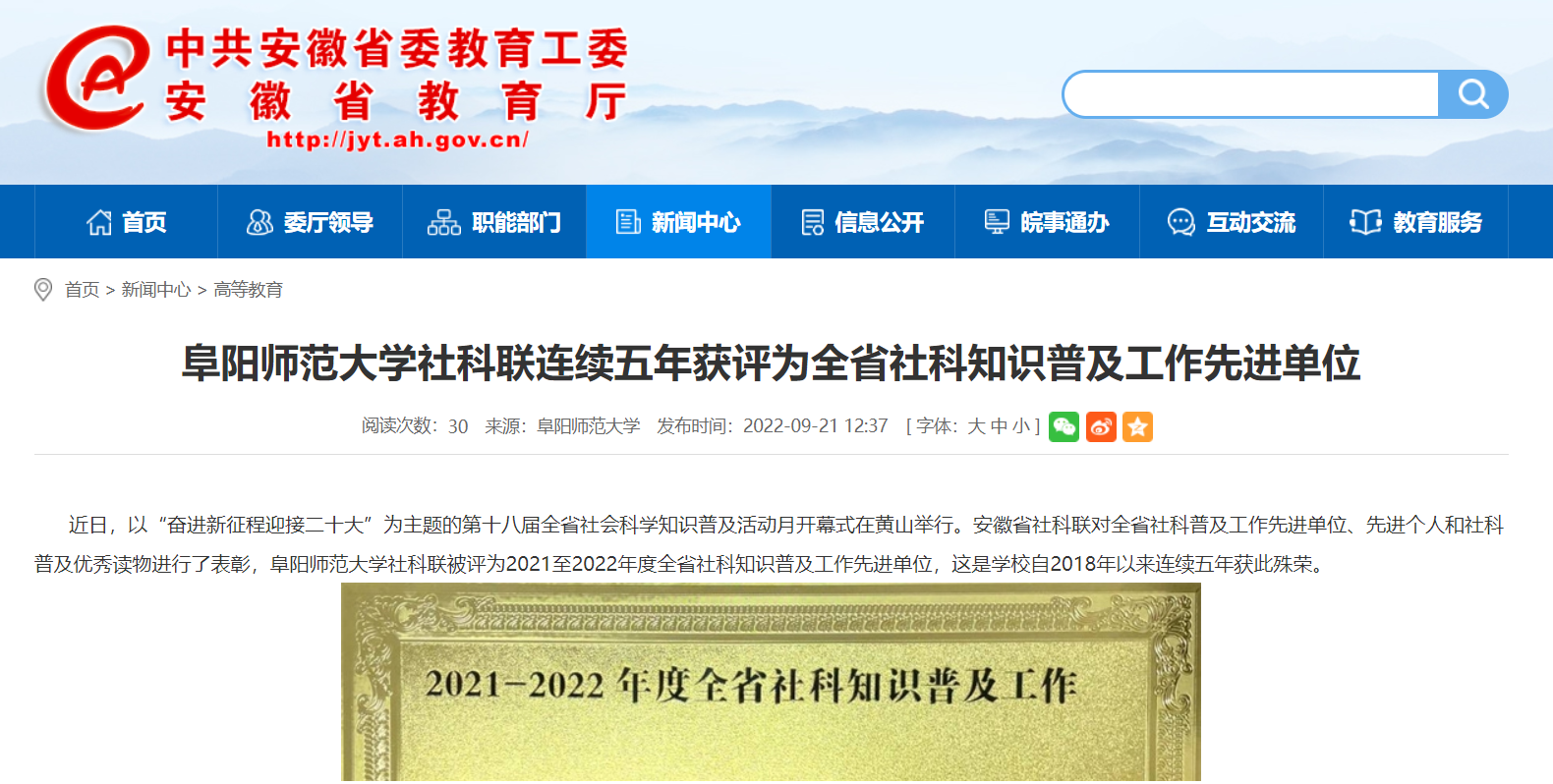 安徽教育网报道:阜阳师范大学社科联连续五年获评为全省社科知识普及工作先进单位