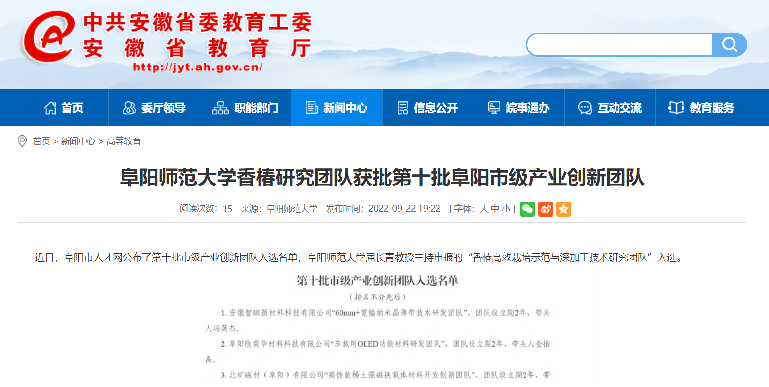 9月22日,安徽教育网报道:阜阳师范大学香椿研究团队获批第十批阜阳市级产业创新团队。文章地址: