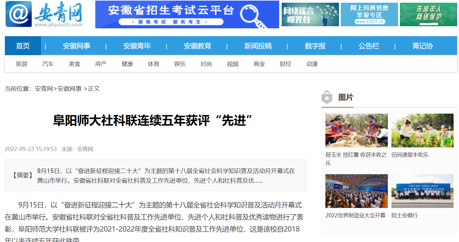 9月23日,安青网报道:阜阳师大社科联连续五年获评“先进”。文章地址: