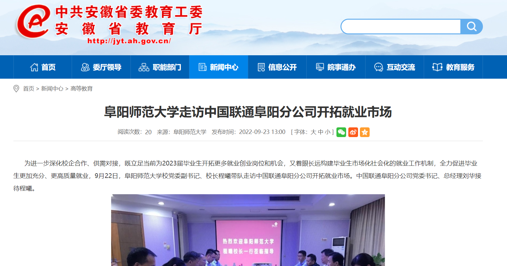 9月23日,安徽教育网报道:阜阳师范大学走访中国联通阜阳分公司开拓就业市场。文章地址: