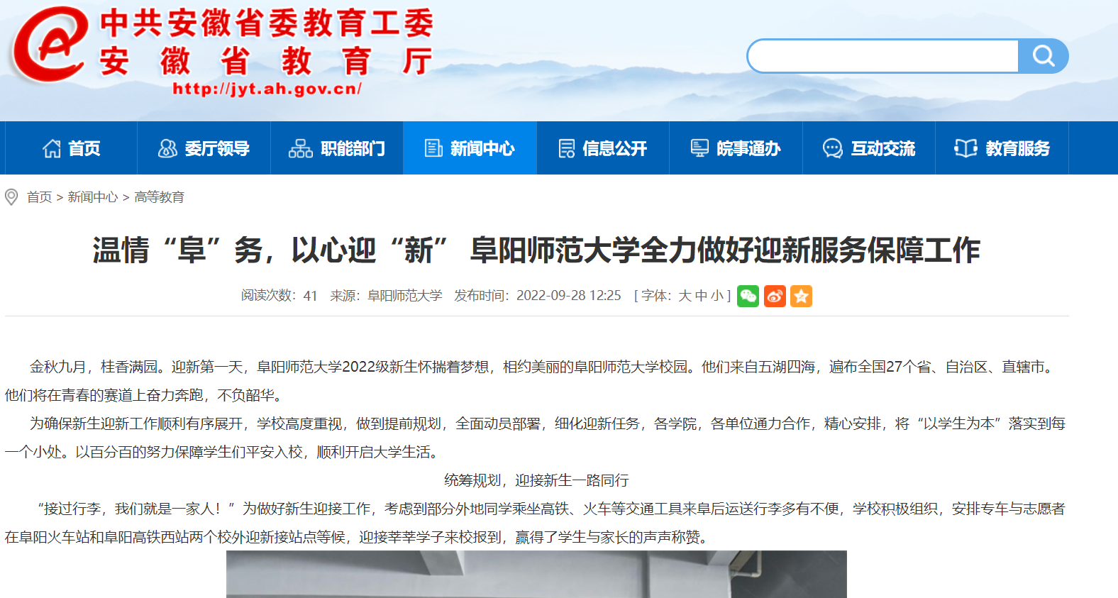 9月28日,安徽教育网报道:温情“阜”务,以心迎“新” 阜阳师范大学全力做好迎新服务保障工作。文章地址: