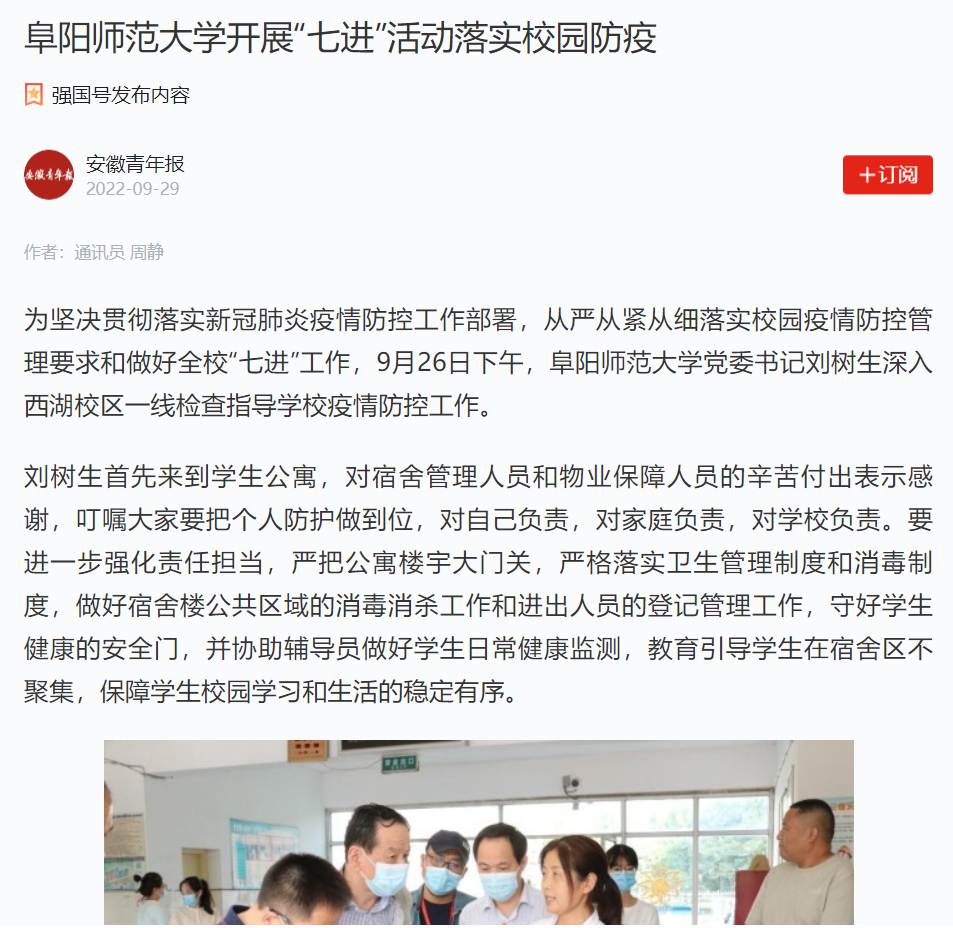 9月29日,“学习强国”安徽青年报报道:阜阳师范大学开展“七进”活动落实校园防疫。文章地址:https://article.xuexi.cn/articles/index.html?art_id=385674817834987685&source=share&study_style_id=feeds_opaque&reco_id=101e5b0afcc9c0a822a3000u&share_to=wx_single&study_share_enable=1&study_comment_disable=0&ptype=0&item_id=385674817834987685