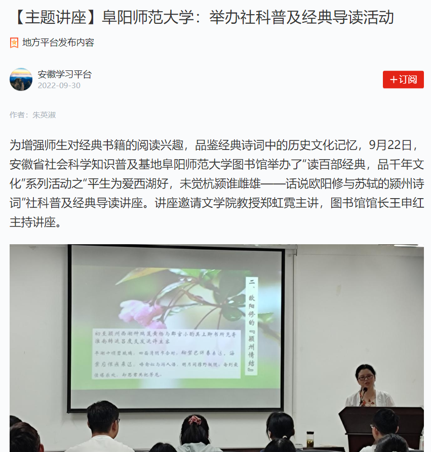 9月30日,“学习强国”安徽学习平台报道:阜阳师范大学:举办社科普及经典导读活动。文章地址:https://article.xuexi.cn/articles/index.html?art_id=13713271370759740460&item_id=13713271370759740460&cdn=https%3A%2F%2Fregion-anhui-resource&study_style_id=feeds_opaque&ref_read_id=9652a658-375a-4667-a4f8-e857a26af086&pid=2815108617963355&ptype=100&reco_id=101e84aff117c0a88413000c&study_comment_disable=1&source=share&share_to=wx_single
