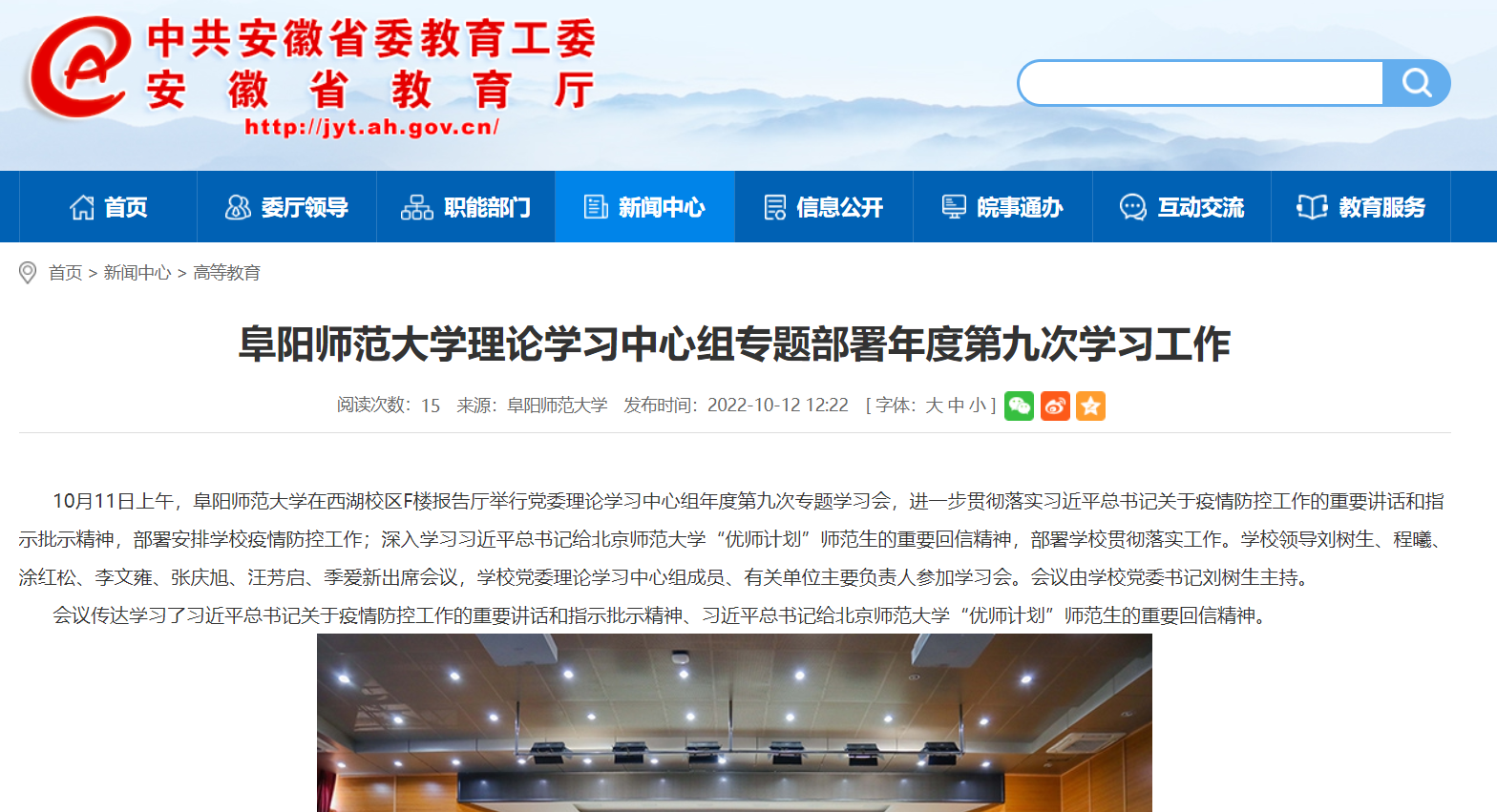 10月12日,安徽教育网报道:阜阳师范大学理论学习中心组专题部署年度第九次学习工作。文章地址: