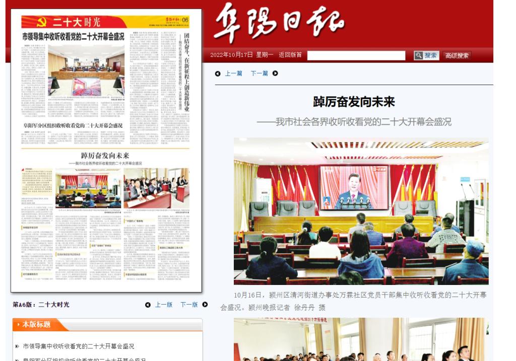 10月17日,阜阳日报报道:卓厉奋发向未来——我市社会各界收听收看党的二十大开幕会盛况。文章地址:http://test.fynews.net/epaper/read.do?m=i&iid=2564&eid=25152&sid=87100&idate=1_2022-10-17