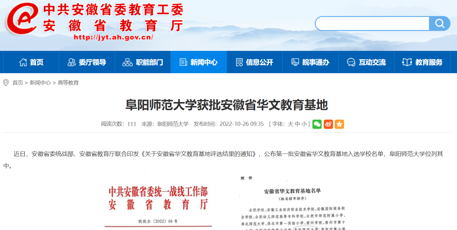10月26日,安徽教育网报道:阜阳师范大学获批安徽省华文教育基地。文章地址:
