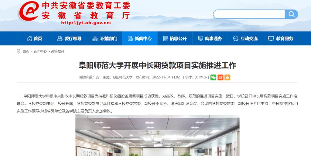 11月4日,安徽教育网报道:阜阳师范大学开展中长期贷款项目实施推进工作。文章地址: