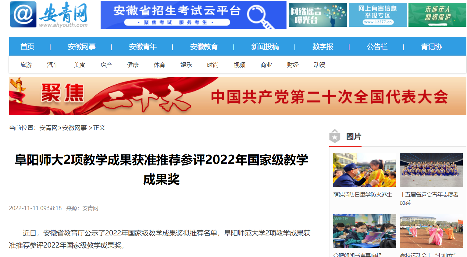 11月11日,安青网报道:阜阳师大2项教学成果获准推荐参评2022年国家级教学成果奖。文章地址: