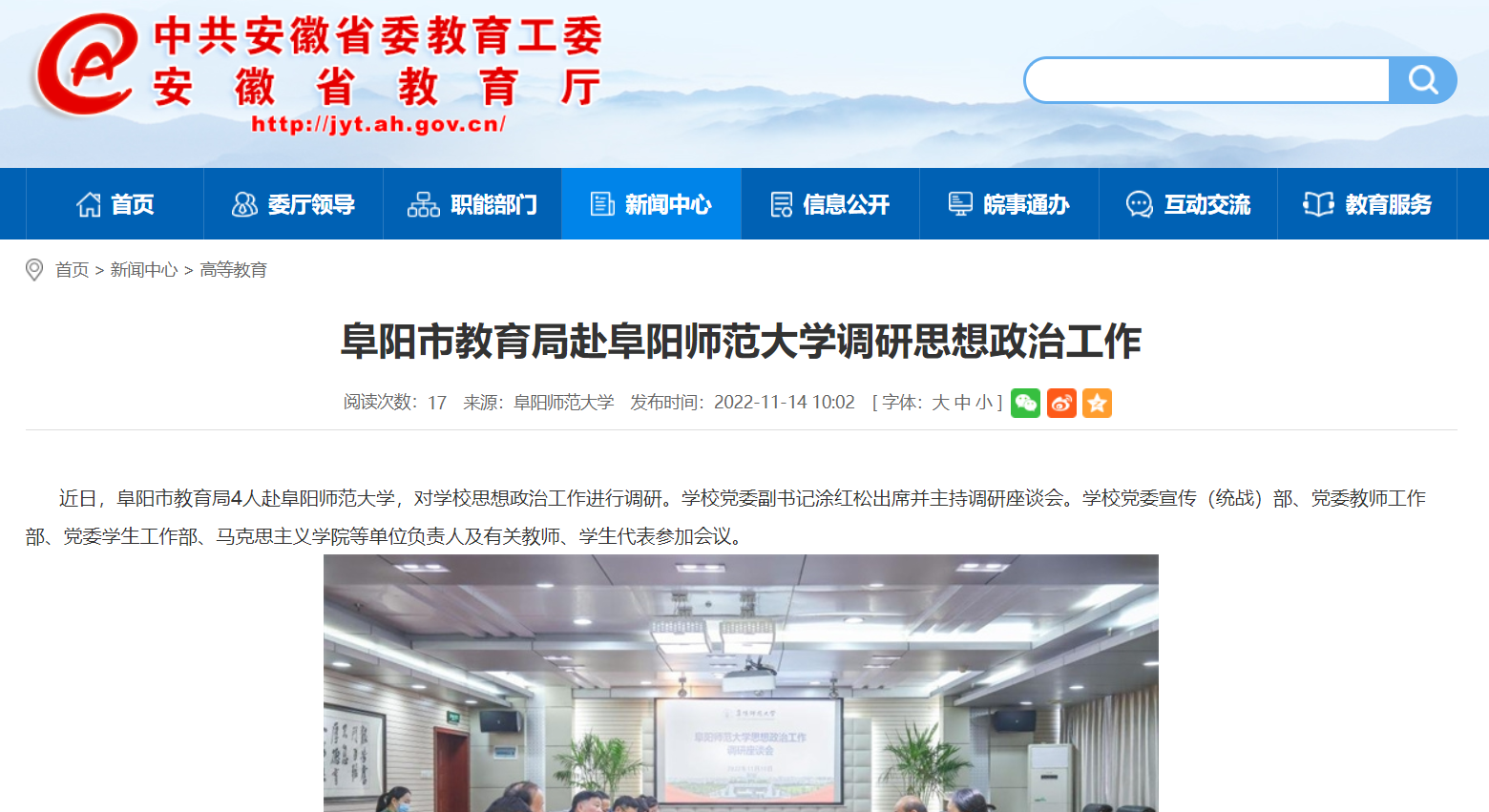 11月14日,安徽教育网报道:阜阳市教育局赴阜阳师范大学调研思想政治工作。文章地址: