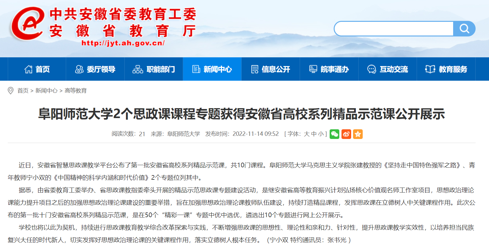 11月14日,安徽教育网报道:阜阳师范大学2个思政课课程专题获得安徽省高校系列精品示范课公开展示。文章地址: