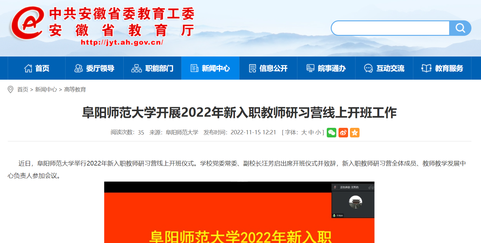 11月15日,安徽教育网报道:阜阳师范大学开展2022年新入职教师研习营线上开班工作。文章地址: