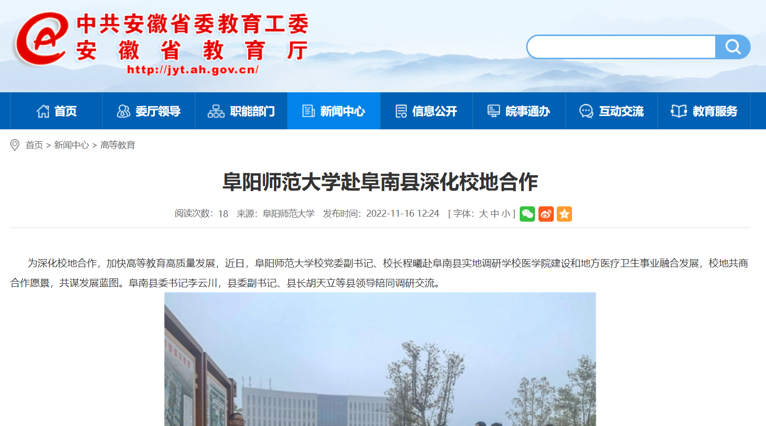 11月16日,安徽教育网报道:阜阳师范大学赴阜南县深化校地合作。文章地址:
