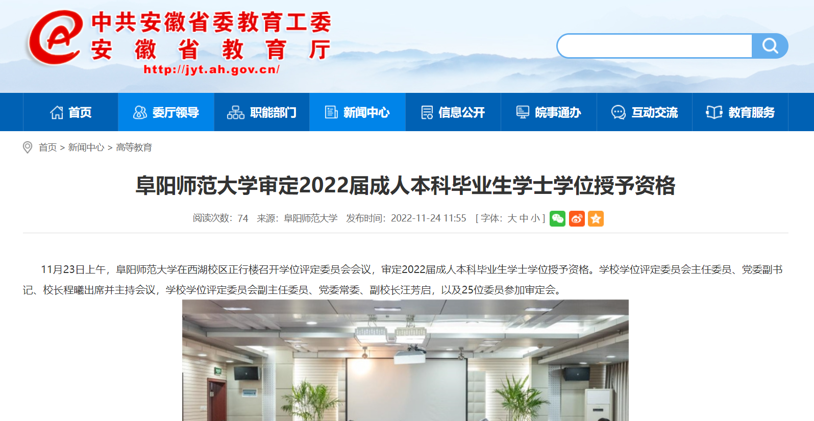 11月24日,安徽教育网报道:阜阳师范大学审定2022届成人本科毕业生学士学位授予资格。文章地址: