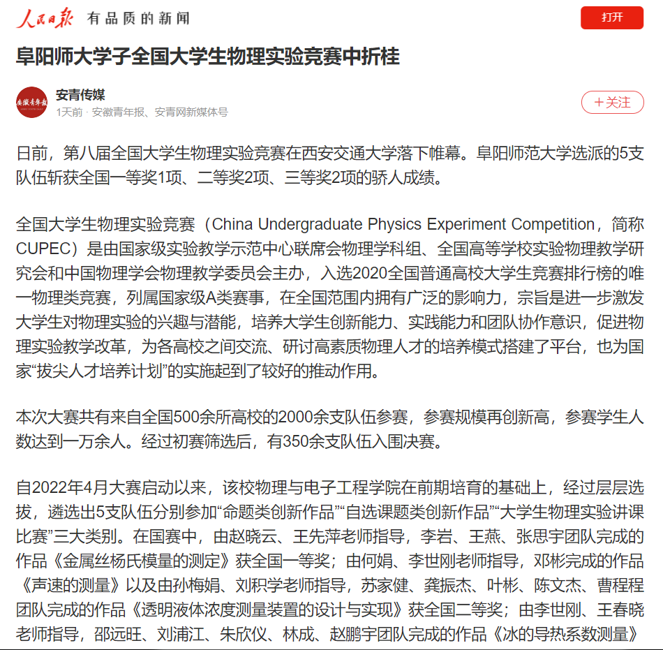 人民日报报道:阜阳师大学子全国大学生物理实验竞赛中折桂
