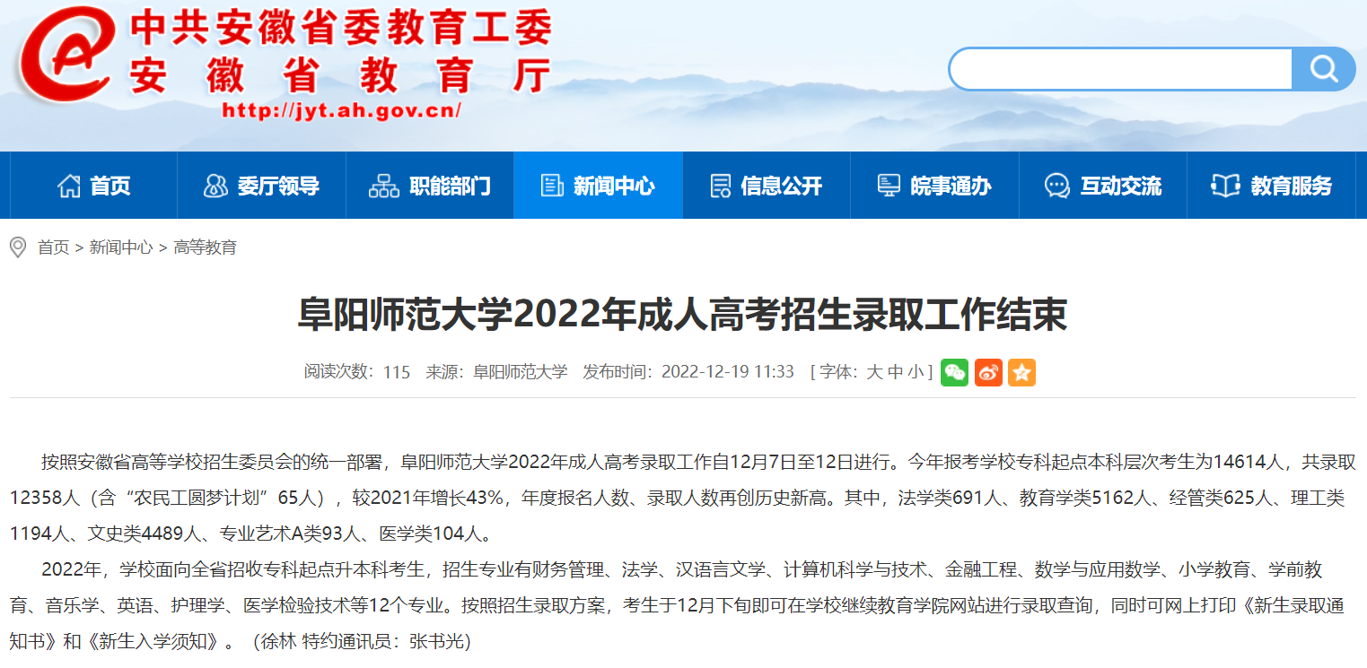 12月19日,安徽教育网报道:阜阳师范大学2022年成人高考招生录取工作结束。文章地址: