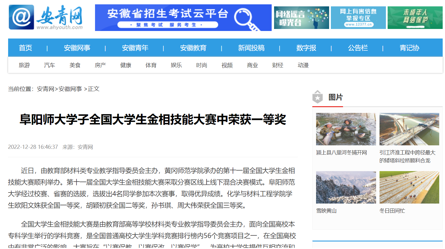 12月28日,安青网报道:阜阳师大学子全国大学生金相技能大赛中荣获一等奖。文章地址: