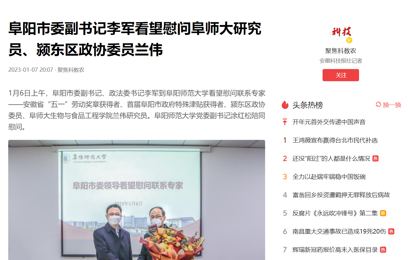 1月07日,今日头条聚焦科教农报道:阜阳市委副书记李军看望慰问阜师大研究员、颍东区政协委员兰伟。文章地址:https://www.toutiao.com/article/7185876907798348321/?app=news_article×tamp=1673097366&use_new_style=1&req_id=20230107211605784D218825640988F10F&group_id=7185876907798348321&share_token=28213CEA-6892-4CEA-8F44-F27226DDEE2F&tt_from=weixin&utm_source=weixin&utm_medium=toutiao_ios&utm_campaign=client_share&wxshare_count=4&source=m_redirect&wid=1673182449323