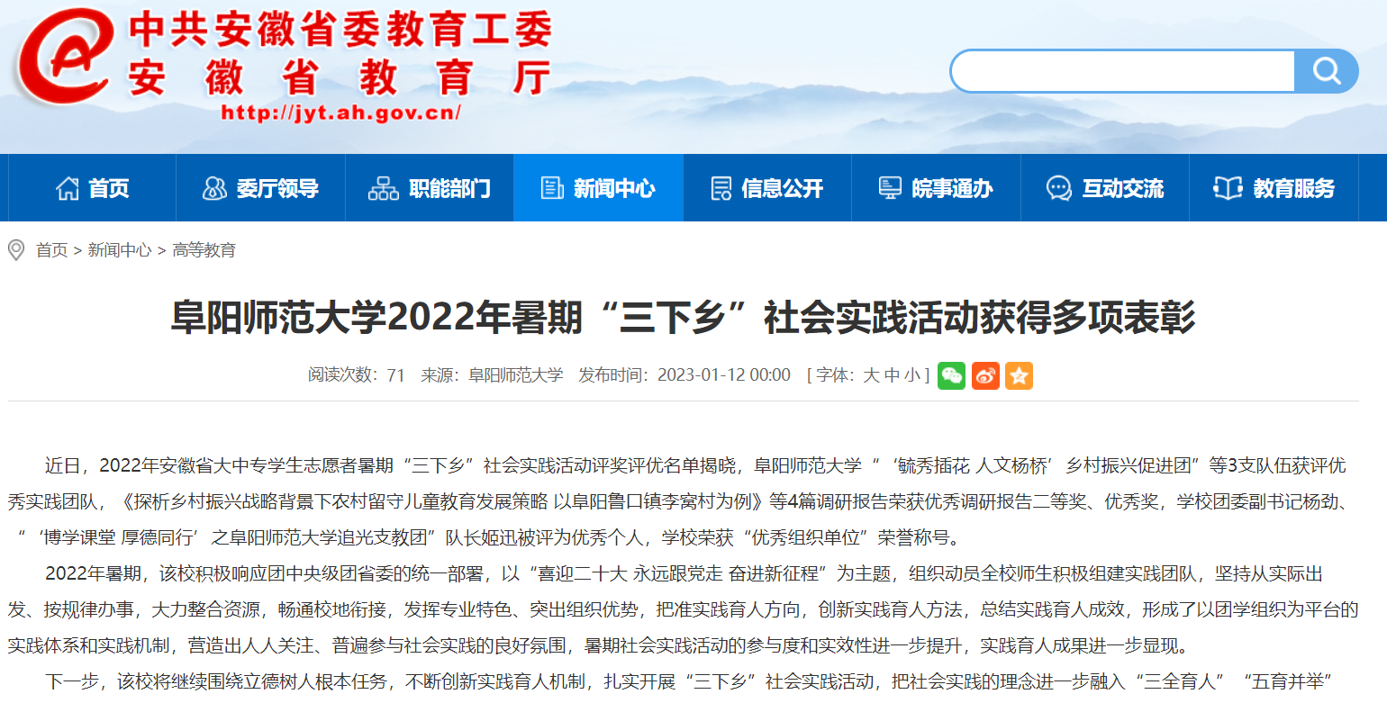 1月12日,安徽教育网报道:阜阳师范大学2022年暑期“三下乡”社会实践活动获得多项表彰。文章地址:
