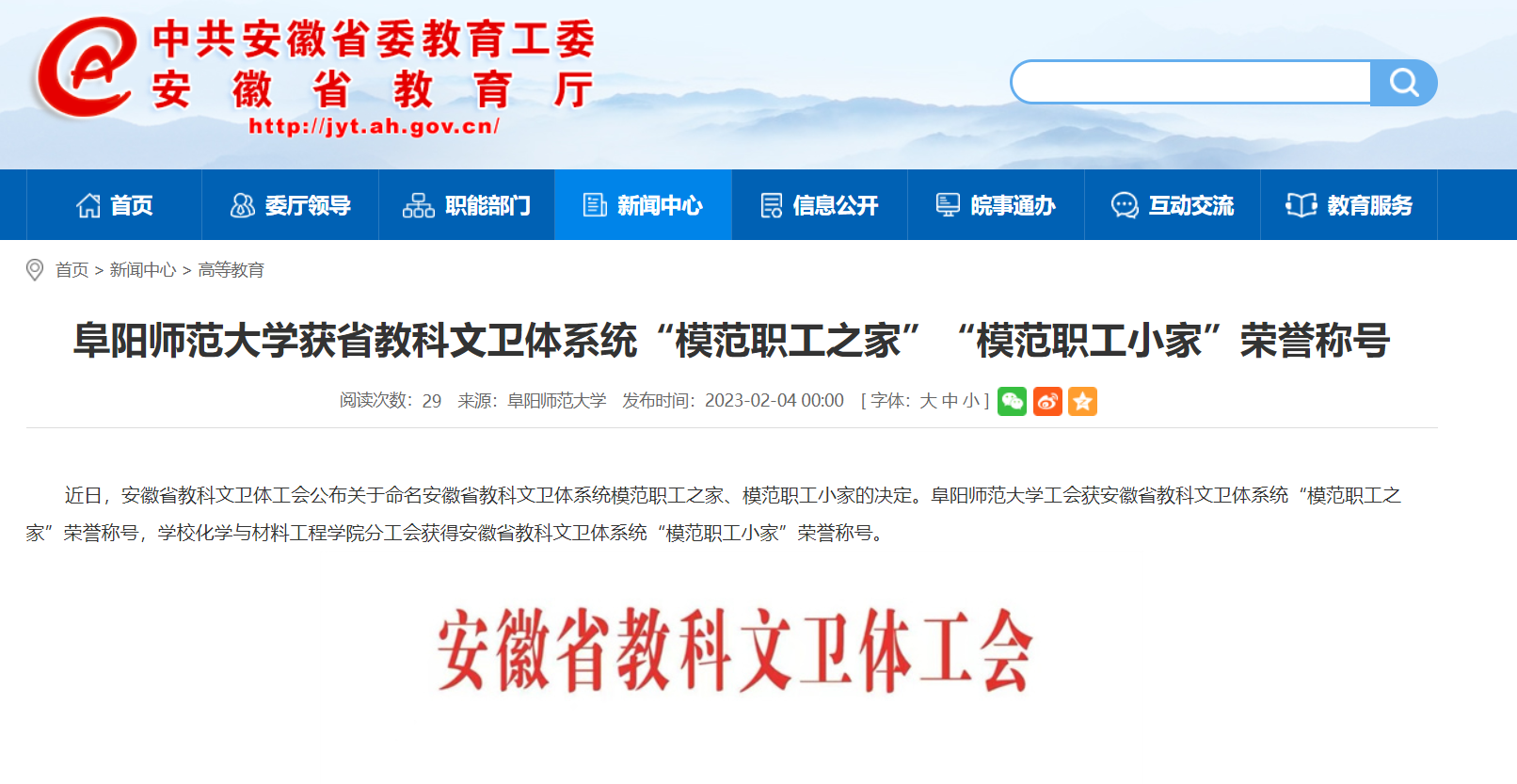 安徽教育网报道:阜阳师范大学获省教科文卫体系统“模范职工之家”“模范职工小家”荣誉称号
