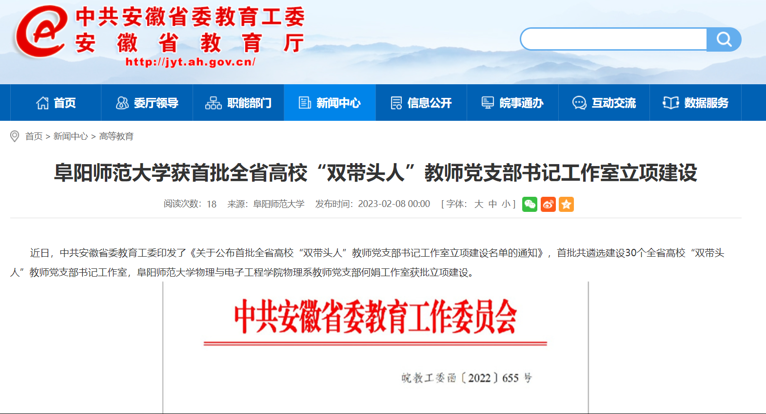 安徽教育网报道:阜阳师范大学获首批全省高校“双带头人”教师党支部书记工作室立项建设