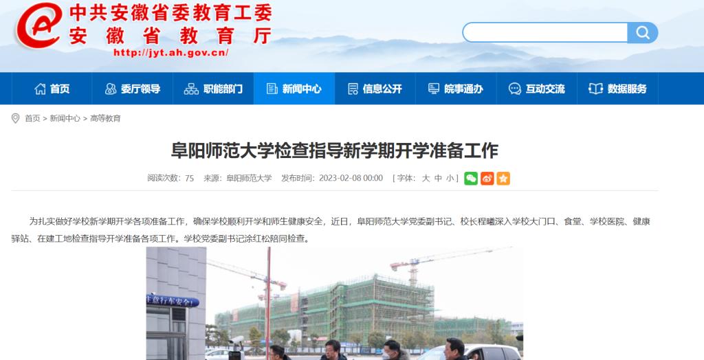 2月8日,安徽教育网报道:阜阳师范大学检查指导新学期开学准备工作。文章地址: