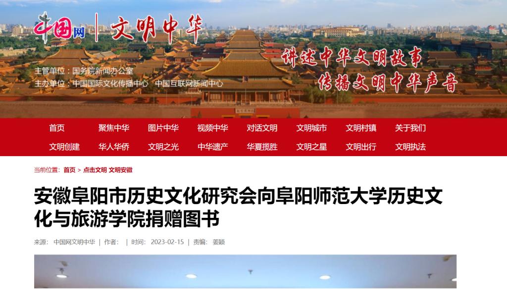 2月15日,中国网文明中华报道:安徽阜阳市历史文化研究会向阜阳师范大学历史文化与旅游学院捐赠图书。文章地址:http://wmzh.china.com.cn/2023-02/15/content_42260345.htm
