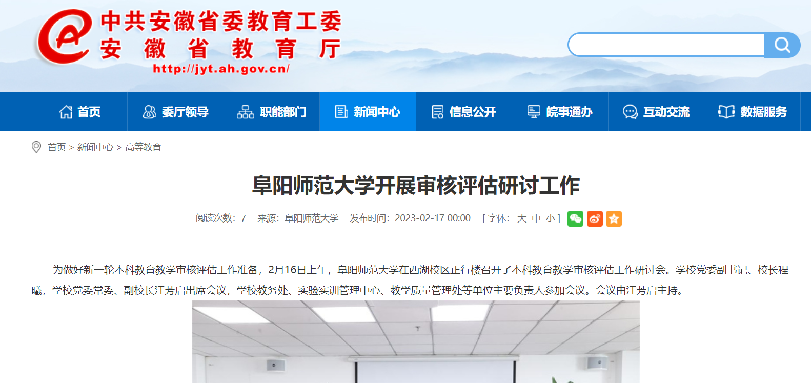 2月17日,安徽教育网报道:阜阳师范大学开展审核评估研讨工作。文章地址: