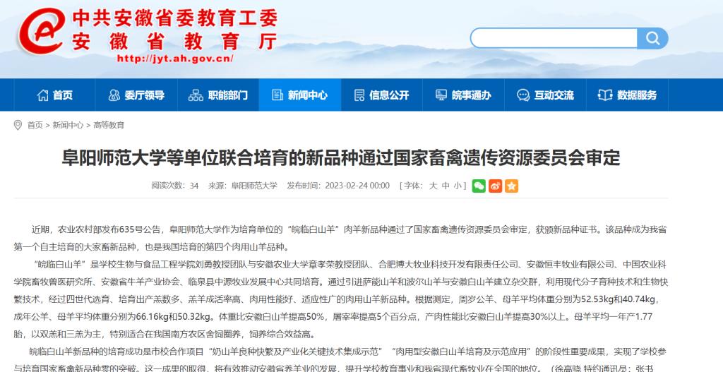 2月24日,安徽教育网报道:阜阳师范大学等单位联合培育的新品种通过国家畜禽遗传资源委员会审定。文章地址: