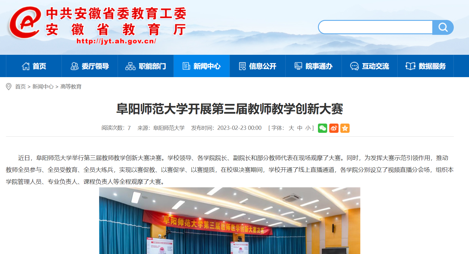 2月23日,安徽教育网报道:阜阳师范大学开展第三届教师教学创新大赛。文章地址: